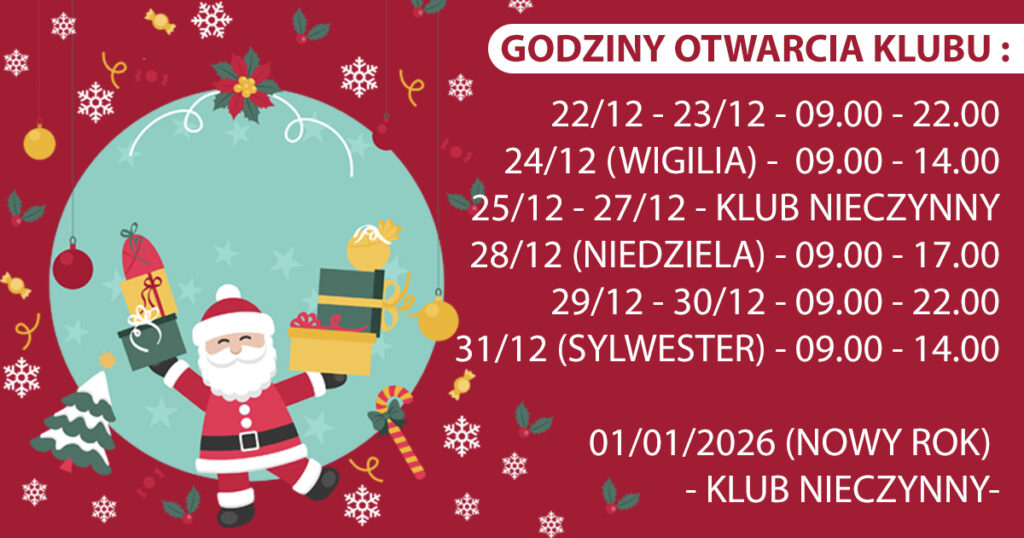 We wtorek 11.11.2025 klub będzie nieczynny.Pozostałe dni – bez zmian.Zapraszamy 10.11 poniedziałek od 09.00 do 22.00zajęcia grupowe w tym dniu:18.30 Pupomania z Lazaro (sala fitness)18.30 Rowery z Moniką (sala rowerowa)19.30 HIIT 1000 z Lazaro (sala Więcej…