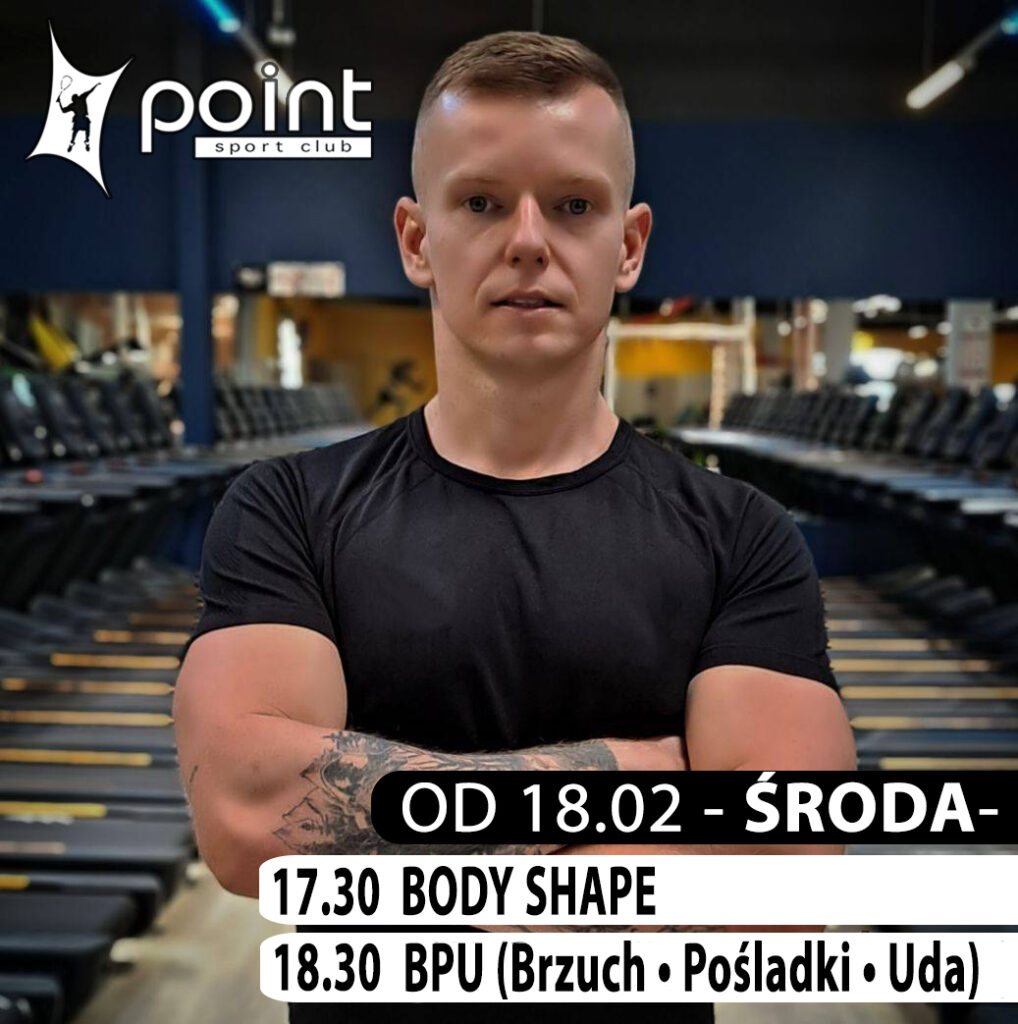 o godz.17.30 BODY SHAPE – zajęcia fitness nastawione na modelowanie sylwetki. Łączą proste ćwiczenia wzmacniające i spalające tłuszcz. Trening jest umiarkowanej intensywności, Efekty: ujędrnienie, wzmocnienie mięśni, lepsza kondycja.